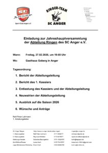 Am Freitag, 27. Februar 2026, findet um 19:00 Uhr im Goberg Anger (Saal 1. OG) die diesjährige Jahreshauptversammlung der Abteilung Ringen statt, zu der alle