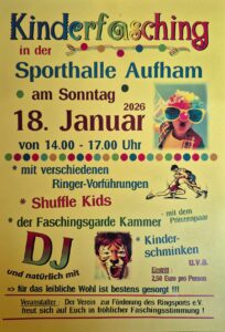 Zum inzwischen dritten Mal in Folge veranstaltet unser Förderverein in genau zwei Wochen wieder den Kinderfasching in der Sporthalle Aufham, zu dem alle Familien und