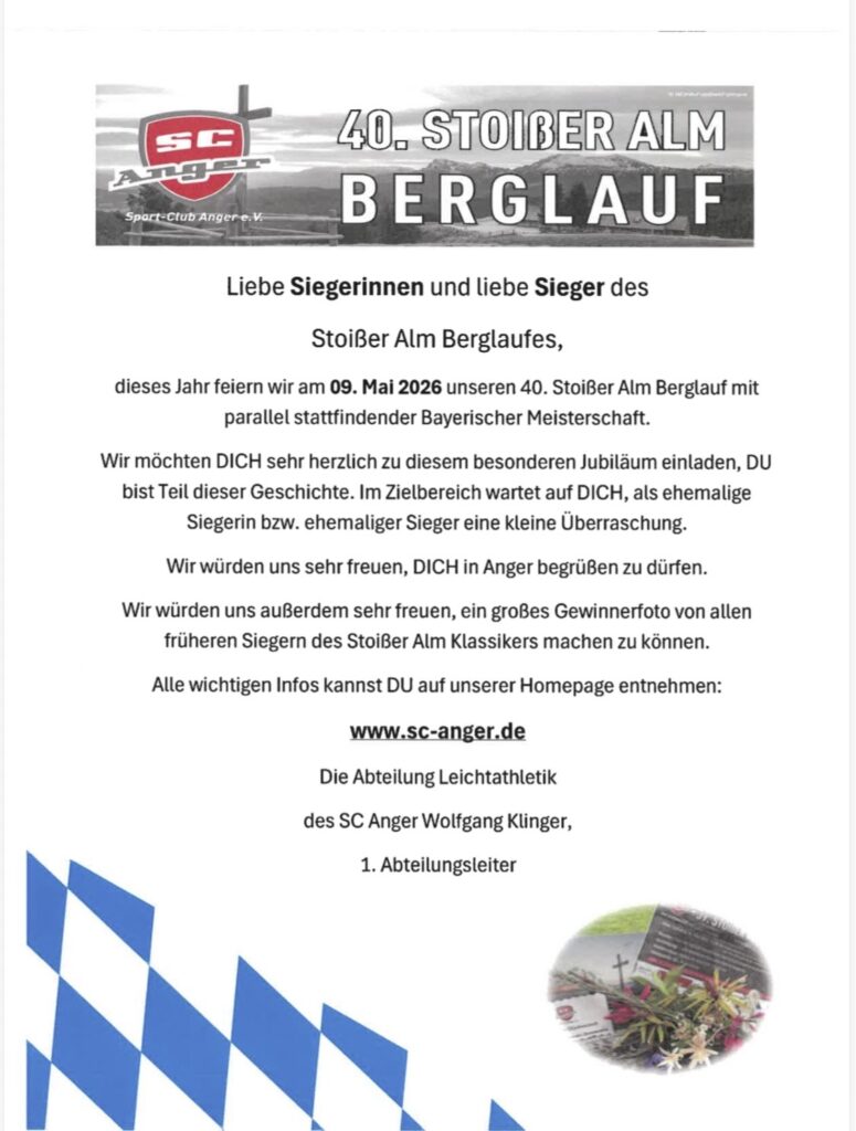Einladung zum 40. Jubiläum Berglauf an alle früheren Siegerinnen und Sieger mit Chronik