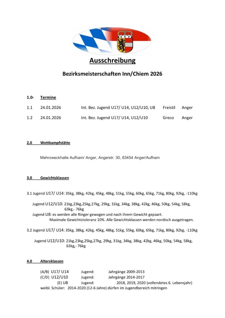 Nach zuletzt 2023 findet die Bezirksmeisterschaft Inn/Chiem + Salzburg heuer wieder in Anger in der Aufhamer Sporthalle statt. In den Altersklassen der E-, C-/D- und A/B-Jugend wird am kommenden Samstag, den 24. Januar 2026, in beiden Stilarten (vormittags Freistil, nachmittags griechisch-römisch) um die Medaillen gerungen. Der Eintritt ist dabei frei und für Verpflegung ist selbstverständlich gesorgt, Vorbeischauen lohnt sich also!